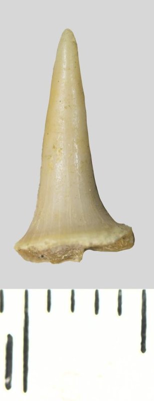 Зуб (фрагмент). Акула. Scapanorhynchus sp. Классификация: Хордовые Chordata, Позвоночные Vertebrata, Хрящевые рыбы Chondrichthyes, Пластиножаберные Elasmobranchii