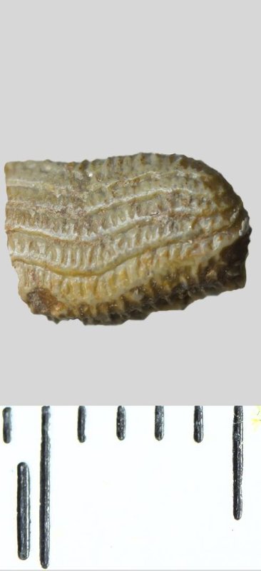 Зуб (фрагмент). Акула. Heterodontus sp. Классификация: Хордовые Chordata, Позвоночные Vertebrata, Хрящевые рыбы Chondrichthyes, Пластиножаберные Elasmobranchii