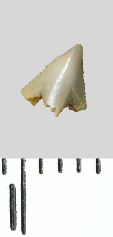 Зуб (фрагмент). Акула. Palaeoanacorax sp. Классификация: Хордовые Chordata, Позвоночные Vertebrata, Хрящевые рыбы Chondrichthyes, Пластиножаберные Elasmobranchii
