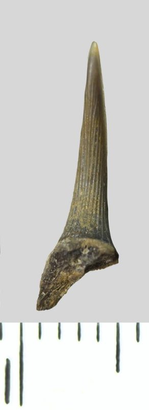 Зуб. Акула. Scapanorhynchus raphiodon (Agassiz, 1843). Классификация: Хордовые Chordata, Позвоночные Vertebrata, Хрящевые рыбы Chondrichthyes, Пластиножаберные Elasmobranchii