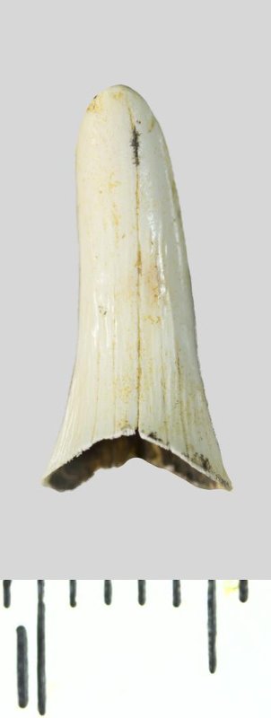 Зуб (фрагмент). Акула. Scapanorhynchus sp. Классификация: Хордовые Chordata, Позвоночные Vertebrata, Хрящевые рыбы Chondrichthyes, Пластиножаберные Elasmobranchii