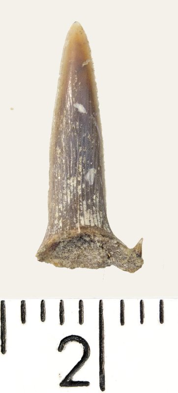 Зуб (фрагмент). Акула. Striatolamia sp. Классификация: Хордовые Chordata, Позвоночные Vertebrata, Хрящевые рыбы Chondrichthyes, Пластиножаберные Elasmobranchii