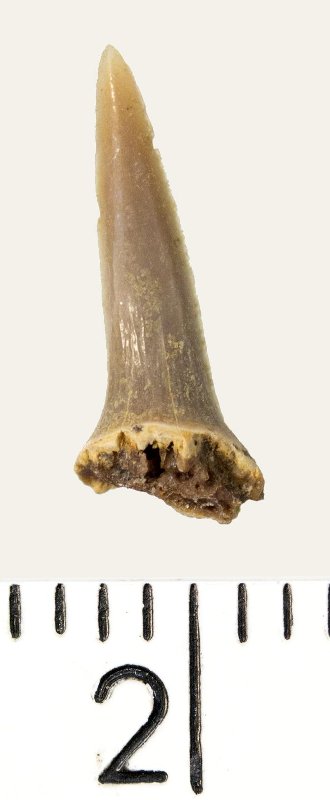 Зуб (фрагмент). Акула. Striatolamia sp. Классификация: Хордовые Chordata, Позвоночные Vertebrata, Хрящевые рыбы Chondrichthyes, Пластиножаберные Elasmobranchii