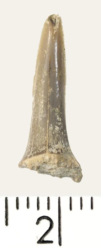 Зуб (фрагмент). Акула. Striatolamia elegans (Agassiz, 1838). Классификация: Хордовые Chordata, Позвоночные Vertebrata, Хрящевые рыбы Chondrichthyes, Пластиножаберные Elasmobranchii