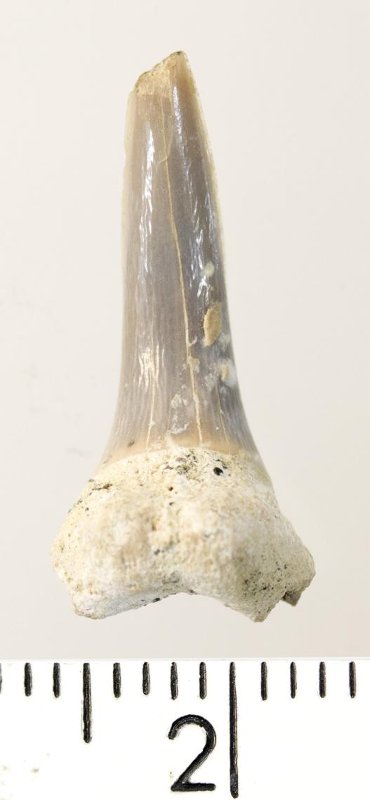 Зуб. Акула. Striatolamia elegans (Agassiz, 1838). Классификация: Хордовые Chordata, Позвоночные Vertebrata, Хрящевые рыбы Chondrichthyes, Пластиножаберные Elasmobranchii