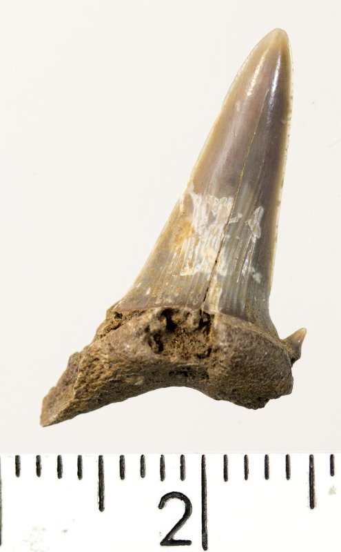 Зуб. Акула. Striatolamia elegans (Agassiz, 1838). Классификация: Хордовые Chordata, Позвоночные Vertebrata, Хрящевые рыбы Chondrichthyes, Пластиножаберные Elasmobranchii
