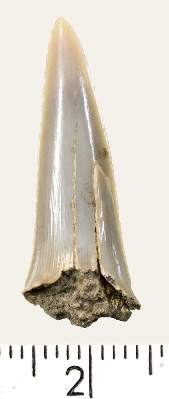 Зуб (фрагмент). Акула. Striatolamia macrota (Agassiz,1843). Классификация: Хордовые Chordata, Позвоночные Vertebrata, Хрящевые рыбы Chondrichthyes, Пластиножаберные Elasmobranchii