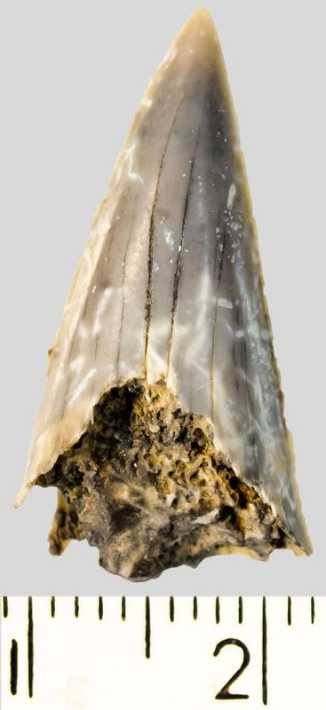 Зуб (фрагмент). Акула. Otodus subserratus (Agassiz, 1843). Классификация: Хордовые Chordata, Позвоночные Vertebrata, Хрящевые рыбы Chondrichthyes, Пластиножаберные Elasmobranchii