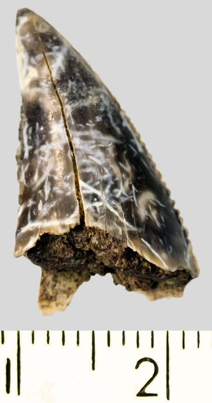 Зуб (фрагмент). Акула. Otodus subserratus (Agassiz, 1843). Классификация: Хордовые Chordata, Позвоночные Vertebrata, Хрящевые рыбы Chondrichthyes, Пластиножаберные Elasmobranchii