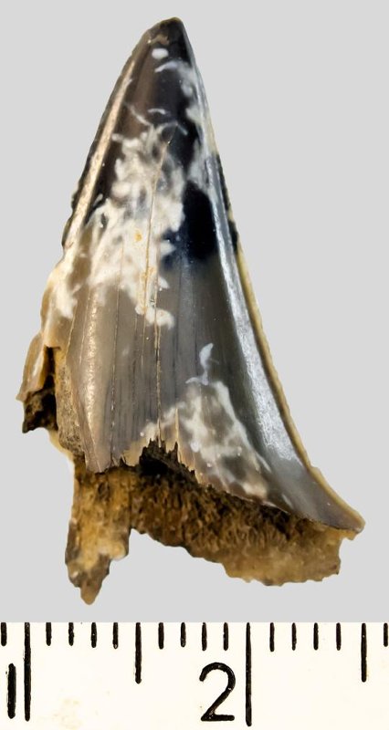 Зуб (фрагмент). Акула. Otodus subserratus (Agassiz, 1843). Классификация: Хордовые Chordata, Позвоночные Vertebrata, Хрящевые рыбы Chondrichthyes, Пластиножаберные Elasmobranchii
