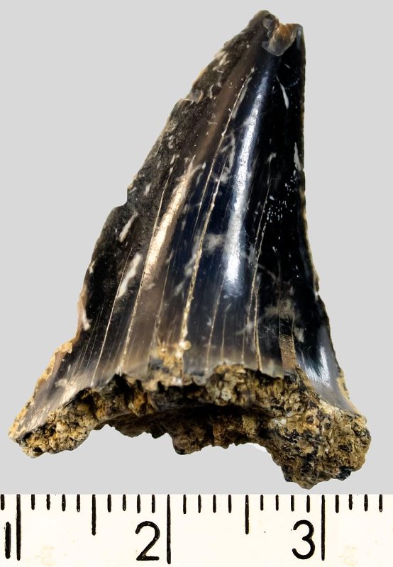Зуб (фрагмент). Акула. Otodus subserratus (Agassiz, 1843). Классификация: Хордовые Chordata, Позвоночные Vertebrata, Хрящевые рыбы Chondrichthyes, Пластиножаберные Elasmobranchii