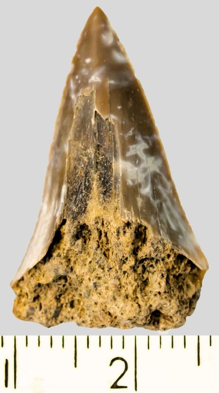 Зуб (фрагмент). Акула. Otodus subserratus (Agassiz, 1843). Классификация: Хордовые Chordata, Позвоночные Vertebrata, Хрящевые рыбы Chondrichthyes, Пластиножаберные Elasmobranchii