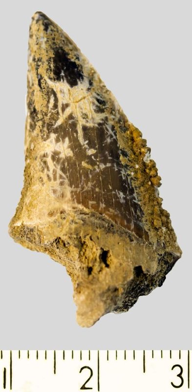 Зуб (фрагмент). Акула. Otodus subserratus (Agassiz, 1843). Классификация: Хордовые Chordata, Позвоночные Vertebrata, Хрящевые рыбы Chondrichthyes, Пластиножаберные Elasmobranchii