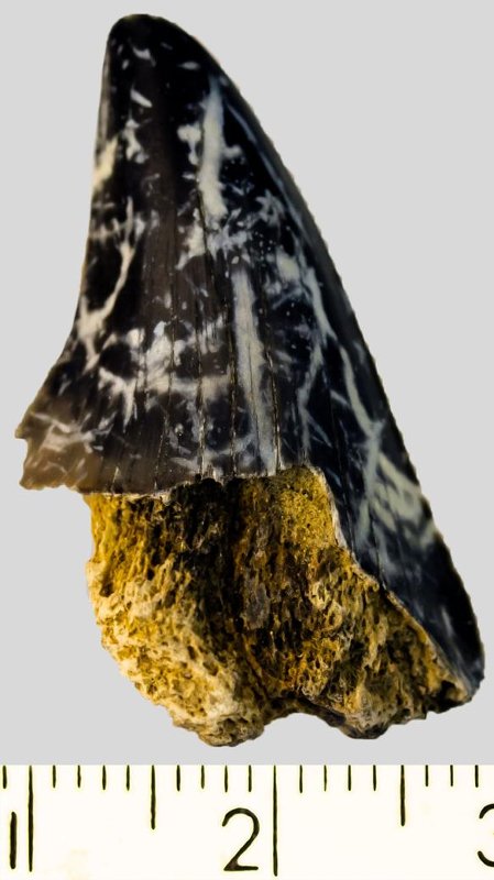 Зуб (фрагмент). Акула. Otodus subserratus (Agassiz, 1843). Классификация: Хордовые Chordata, Позвоночные Vertebrata, Хрящевые рыбы Chondrichthyes, Пластиножаберные Elasmobranchii