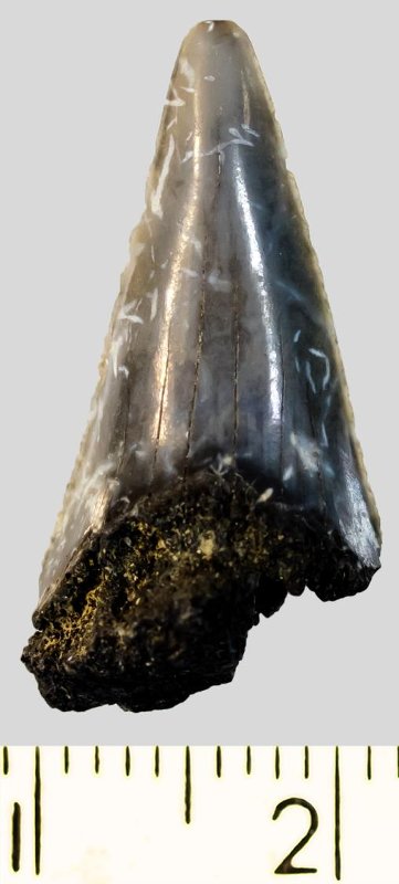 Зуб (фрагмент). Акула. Otodus subserratus (Agassiz, 1843). Классификация: Хордовые Chordata, Позвоночные Vertebrata, Хрящевые рыбы Chondrichthyes, Пластиножаберные Elasmobranchii