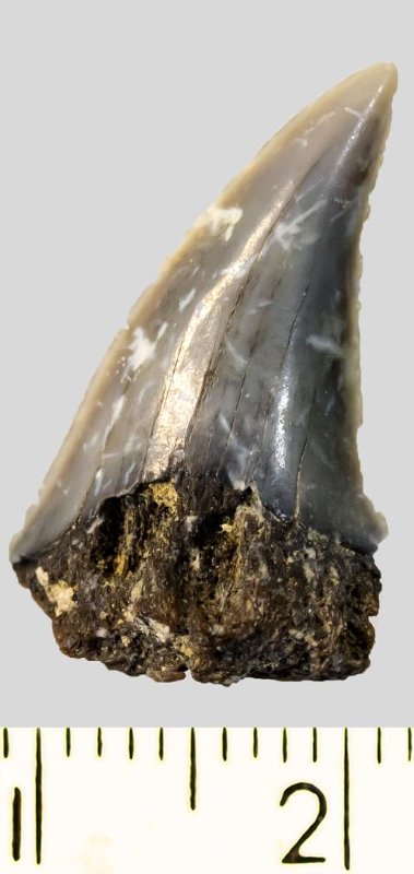 Зуб (фрагмент). Акула. Otodus subserratus (Agassiz, 1843). Классификация: Хордовые Chordata, Позвоночные Vertebrata, Хрящевые рыбы Chondrichthyes, Пластиножаберные Elasmobranchii