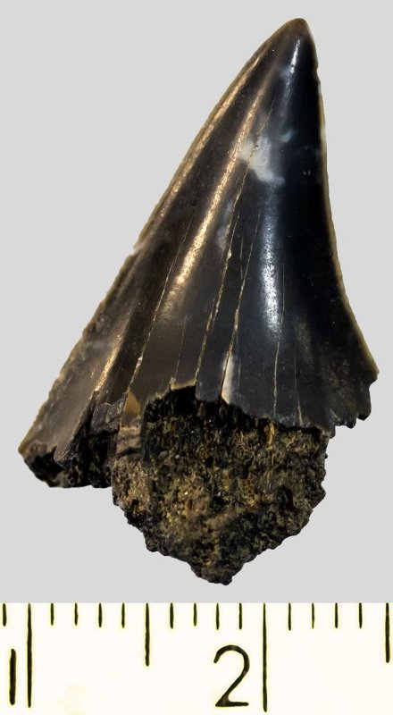 Зуб (фрагмент). Акула. Otodus subserratus (Agassiz, 1843). Классификация: Хордовые Chordata, Позвоночные Vertebrata, Хрящевые рыбы Chondrichthyes, Пластиножаберные Elasmobranchii