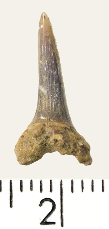 Зуб. Акула. Striatolamia elegans (Agassiz, 1838). Классификация: Хордовые Chordata, Позвоночные Vertebrata, Хрящевые рыбы Chondrichthyes, Пластиножаберные Elasmobranchii