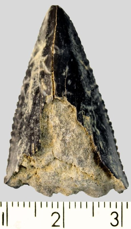 Зуб (фрагмент). Акула. Otodus subserratus (Agassiz, 1843). Классификация: Хордовые Chordata, Позвоночные Vertebrata, Хрящевые рыбы Chondrichthyes, Пластиножаберные Elasmobranchii