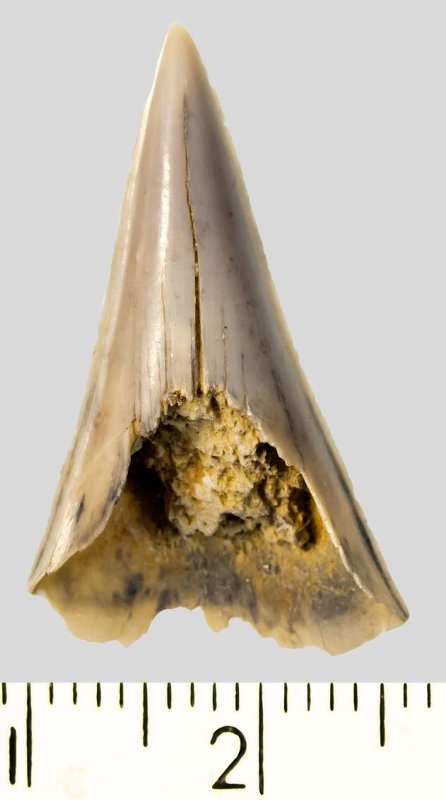 Зуб (фрагмент). Акула. Otodus subserratus (Agassiz, 1843). Классификация: Хордовые Chordata, Позвоночные Vertebrata, Хрящевые рыбы Chondrichthyes, Пластиножаберные Elasmobranchii