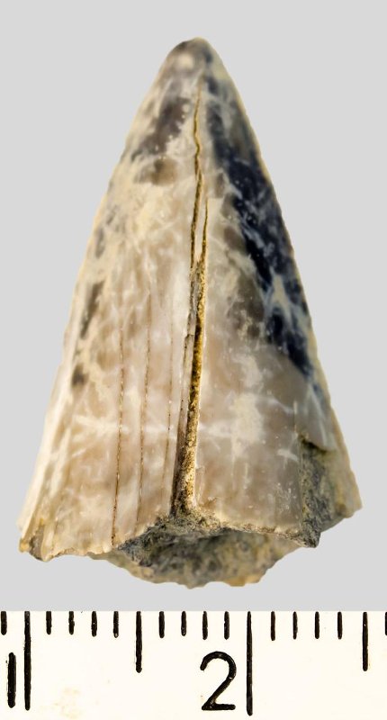 Зуб (фрагмент). Акула. Otodus subserratus (Agassiz, 1843). Классификация: Хордовые Chordata, Позвоночные Vertebrata, Хрящевые рыбы Chondrichthyes, Пластиножаберные Elasmobranchii