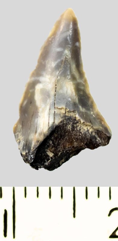 Зуб (фрагмент). Акула. Otodus subserratus (Agassiz, 1843). Классификация: Хордовые Chordata, Позвоночные Vertebrata, Хрящевые рыбы Chondrichthyes, Пластиножаберные Elasmobranchii