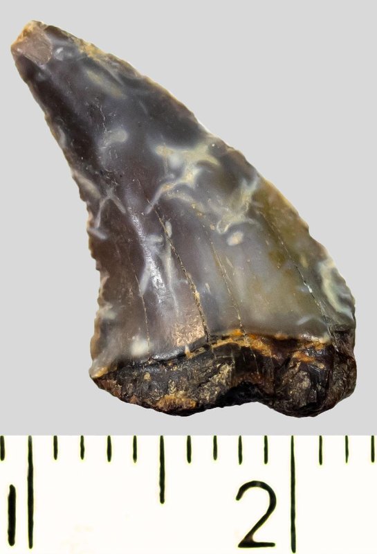Зуб (фрагмент). Акула. Otodus subserratus (Agassiz, 1843). Классификация: Хордовые Chordata, Позвоночные Vertebrata, Хрящевые рыбы Chondrichthyes, Пластиножаберные Elasmobranchii