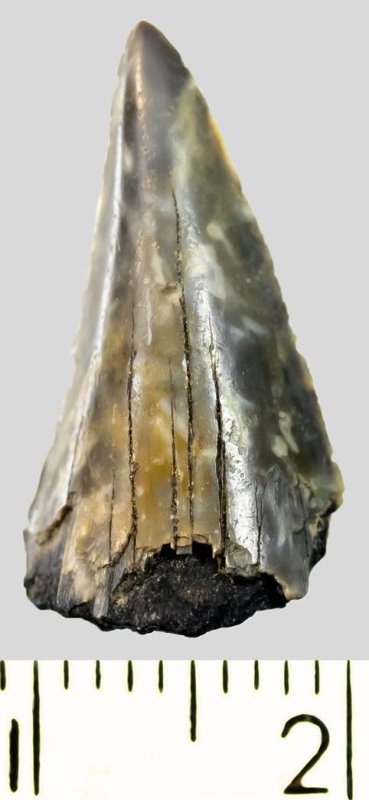 Зуб (фрагмент). Акула. Otodus subserratus (Agassiz, 1843). Классификация: Хордовые Chordata, Позвоночные Vertebrata, Хрящевые рыбы Chondrichthyes, Пластиножаберные Elasmobranchii