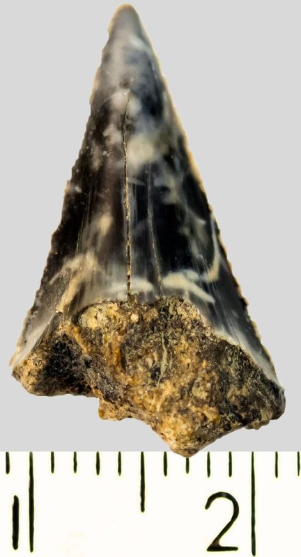 Зуб (фрагмент). Акула. Otodus subserratus (Agassiz, 1843). Классификация: Хордовые Chordata, Позвоночные Vertebrata, Хрящевые рыбы Chondrichthyes, Пластиножаберные Elasmobranchii