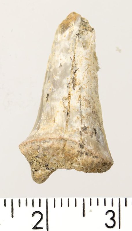 Зуб (фрагмент). Акула. Striatolamia macrota (Agassiz,1843). Классификация: Хордовые Chordata, Позвоночные Vertebrata, Хрящевые рыбы Chondrichthyes, Пластиножаберные Elasmobranchii