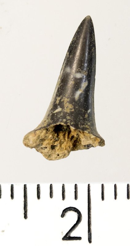 Зуб (фрагмент). Акула. Hypotodus sp. Классификация: Хордовые Chordata, Позвоночные Vertebrata, Хрящевые рыбы Chondrichthyes, Пластиножаберные Elasmobranchii
