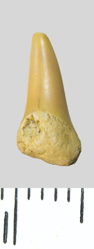 Зуб (фрагмент). Акула. Lamniformes gen. et sp. indet. Классификация: Хордовые Chordata, Позвоночные Vertebrata, Хрящевые рыбы Chondrichthyes, Пластиножаберные Elasmobranchii