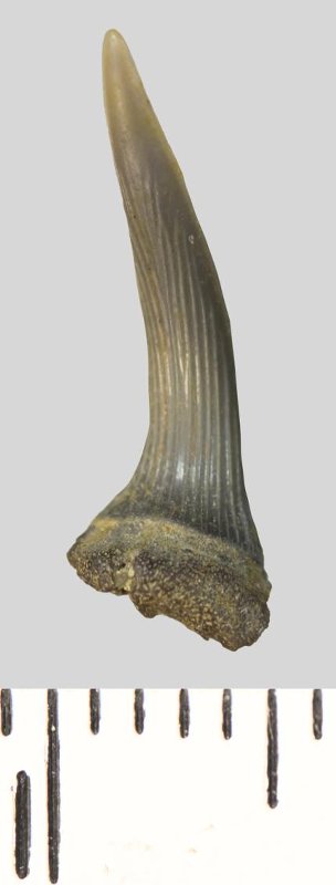 Зуб (фрагмент). Акула. Scapanorhynchus raphiodon (Agassiz, 1843). Классификация: Хордовые Chordata, Позвоночные Vertebrata, Хрящевые рыбы Chondrichthyes, Пластиножаберные Elasmobranchii