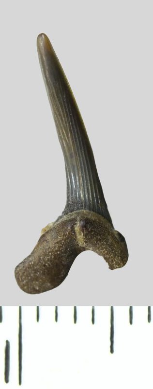 Зуб. Акула. Scapanorhynchus raphiodon (Agassiz, 1843). Классификация: Хордовые Chordata, Позвоночные Vertebrata, Хрящевые рыбы Chondrichthyes, Пластиножаберные Elasmobranchii