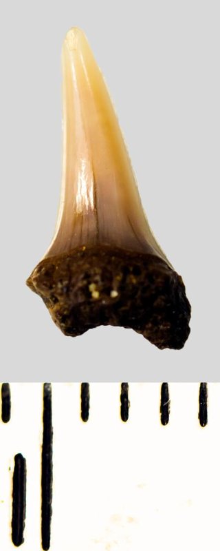 Зуб. Акула. Eostriatolamia subulata (Agassiz, 1843). Классификация: Хордовые Chordata, Позвоночные Vertebrata, Хрящевые рыбы Chondrichthyes, Пластиножаберные Elasmobranchii, Акулы Selachii, Ламнообразные Lamniformes, Песчаные акулы Odontaspididae