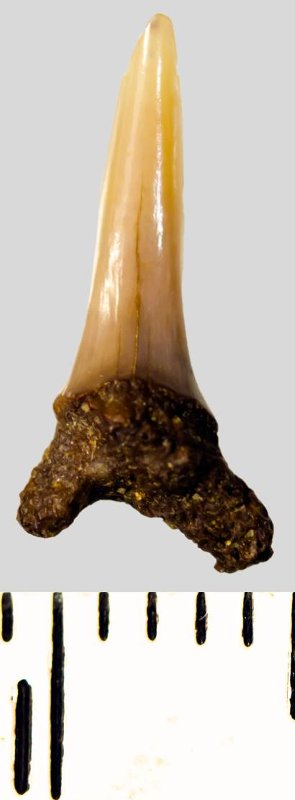 Мелкий боковой зуб с коронкой рыжевато-бежевого цвета, колюще-режущего типа, S-образно изогнутой, с гладким режущим краем. С лингвальной стороны у основания коронки на эмали имеется скульптура в виде слабой продольной струйчатости. Корень бурый, арочный, умеренно массивный, со следами окатанности, левая ветвь утрачена. Имеется одна питательная борозда с лингвальной стороны корня. Добавочные зубцы коронки зуба отсутствуют.