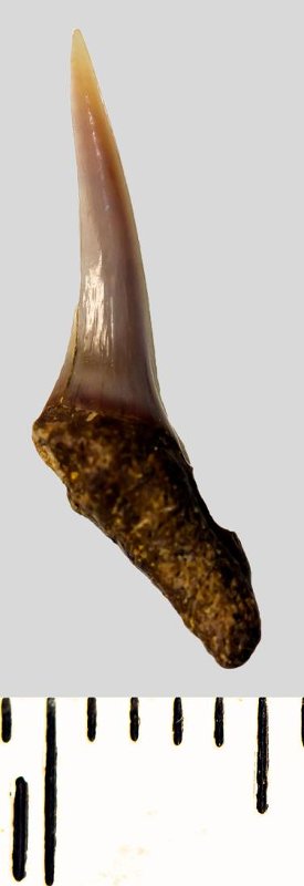 Мелкий боковой зуб с коронкой рыжевато-бежевого цвета, колюще-режущего типа, S-образно изогнутой, с гладким режущим краем. С лингвальной стороны у основания коронки на эмали имеется скульптура в виде слабой продольной струйчатости. Корень бурый, арочный, умеренно массивный, со следами окатанности, левая ветвь утрачена. Имеется одна питательная борозда с лингвальной стороны корня. Добавочные зубцы коронки зуба отсутствуют.