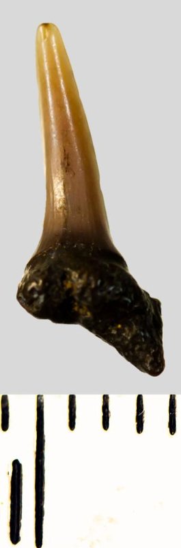 Мелкий боковой зуб с коронкой рыжевато-бежевого цвета, колюще-режущего типа, S-образно изогнутой, с гладким режущим краем. С лингвальной стороны у основания коронки на эмали имеется скульптура в виде слабой продольной струйчатости. Корень бурый, арочный, умеренно массивный, со следами окатанности, левая ветвь утрачена. Имеется одна питательная борозда с лингвальной стороны корня. Добавочные зубцы коронки зуба отсутствуют.
