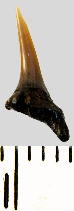 Мелкий боковой зуб с коронкой рыжевато-бежевого цвета, колюще-режущего типа, S-образно изогнутой, с гладким режущим краем. С лингвальной стороны у основания коронки на эмали имеется скульптура в виде слабой продольной струйчатости. Корень бурый, арочный, умеренно массивный, со следами окатанности, левая ветвь утрачена. Имеется одна питательная борозда с лингвальной стороны корня. Добавочные зубцы коронки зуба отсутствуют.