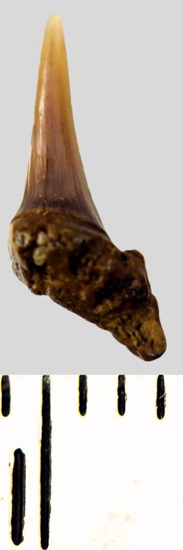 Мелкий боковой зуб с коронкой рыжевато-бежевого цвета, колюще-режущего типа, S-образно изогнутой, с гладким режущим краем. С лингвальной стороны у основания коронки на эмали имеется скульптура в виде слабой продольной струйчатости. Корень бурый, арочный, умеренно массивный, со следами окатанности, левая ветвь утрачена. Имеется одна питательная борозда с лингвальной стороны корня. Добавочные зубцы коронки зуба отсутствуют.