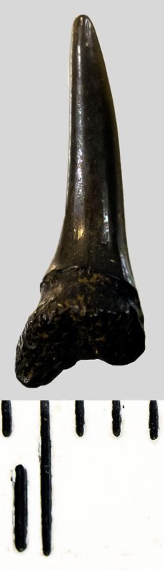 Зуб. Акула. Scapanorhynchus sp. Классификация: Хордовые Chordata, Позвоночные Vertebrata, Хрящевые рыбы Chondrichthyes, Пластиножаберные Elasmobranchii, Акулы Selachii, Ламнообразные Lamniformes