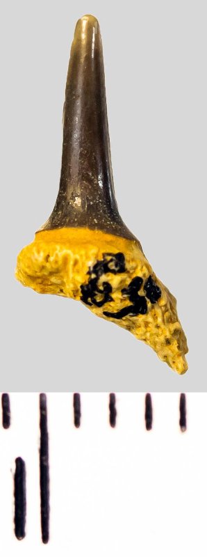 Мелкий боковой зуб с коронкой бурого цвета, колюще-режущего типа, S-образно изогнутой, с гладким режущим краем. Корень охристый, арочный, умеренно массивный, со следами окатанности и эрозии; утрачена левая ветвь. Добавочные зубцы коронки не сохранились.