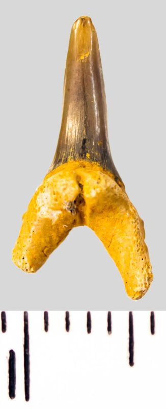 Зуб. Акула. Scapanorhynchus sp. Классификация: Хордовые Chordata, Позвоночные Vertebrata, Хрящевые рыбы Chondrichthyes, Пластиножаберные Elasmobranchii, Акулы Selachii, Ламнообразные Lamniformes