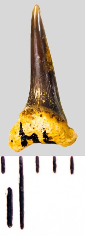 Зуб. Акула. Scapanorhynchus sp. Классификация: Хордовые Chordata, Позвоночные Vertebrata, Хрящевые рыбы Chondrichthyes, Пластиножаберные Elasmobranchii, Акулы Selachii, Ламнообразные Lamniformes