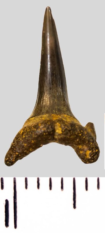 Мелкий боковой зуб с коронкой черного цвета, режущего типа, S-образно изогнутой, с гладким режущим краем. С лингвальной стороны у основания коронки на эмали имеется скульптура в виде слабой продольной струйчатости. Корень черно-охристый, арочный, умеренно массивный, со следами окатанности. С лингвальной стороны корня питательная борозда. Имелась одна пара добавочных зубцов коронки, сохранился только правый.