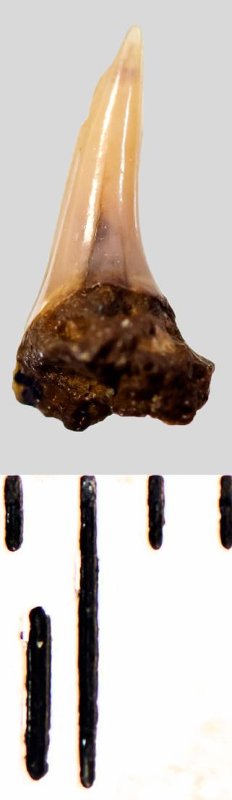Зуб. Акула. Eostriatolamia subulata (Agassiz, 1843). Классификация: Хордовые Chordata, Позвоночные Vertebrata, Хрящевые рыбы Chondrichthyes, Пластиножаберные Elasmobranchii, Акулы Selachii, Ламнообразные Lamniformes, Песчаные акулы Odontaspididae