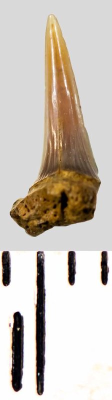 Зуб. Акула. Eostriatolamia subulata (Agassiz, 1843). Классификация: Хордовые Chordata, Позвоночные Vertebrata, Хрящевые рыбы Chondrichthyes, Пластиножаберные Elasmobranchii, Акулы Selachii, Ламнообразные Lamniformes, Песчаные акулы Odontaspididae