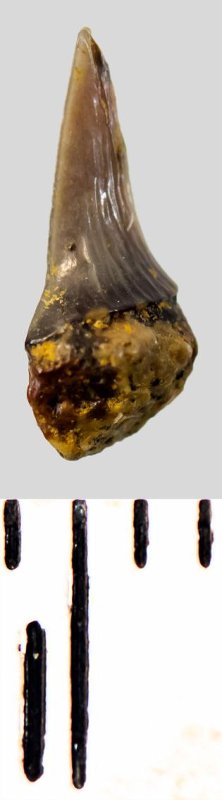 Зуб. Акула. Eostriatolamia subulata (Agassiz, 1843). Классификация: Хордовые Chordata, Позвоночные Vertebrata, Хрящевые рыбы Chondrichthyes, Пластиножаберные Elasmobranchii, Акулы Selachii, Ламнообразные Lamniformes, Песчаные акулы Odontaspididae