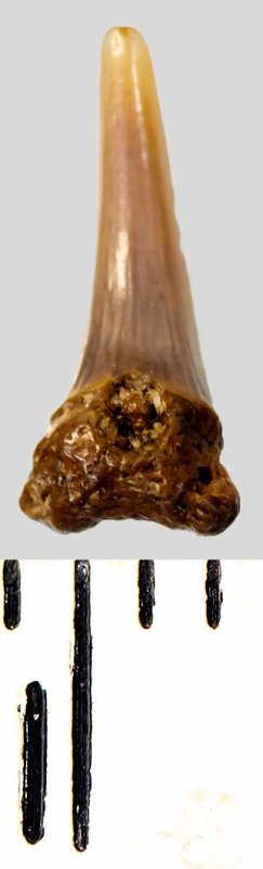 Зуб. Акула. Eostriatolamia subulata (Agassiz, 1843). Классификация: Хордовые Chordata, Позвоночные Vertebrata, Хрящевые рыбы Chondrichthyes, Пластиножаберные Elasmobranchii, Акулы Selachii, Ламнообразные Lamniformes, Песчаные акулы Odontaspididae