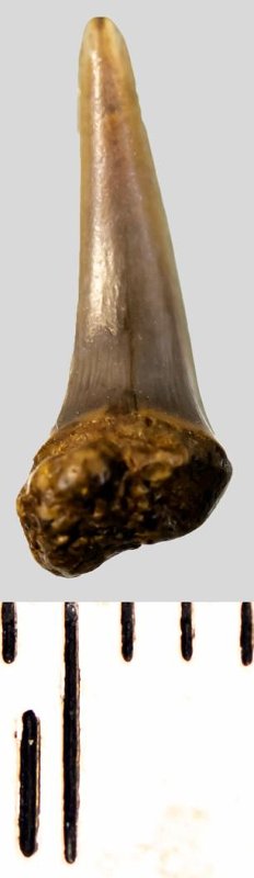 Зуб. Акула. Eostriatolamia subulata (Agassiz, 1843). Классификация: Хордовые Chordata, Позвоночные Vertebrata, Хрящевые рыбы Chondrichthyes, Пластиножаберные Elasmobranchii, Акулы Selachii, Ламнообразные Lamniformes, Песчаные акулы Odontaspididae